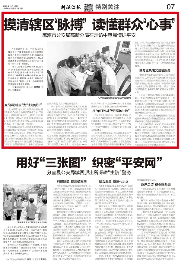 一张张翔实的“民情台账”,最终汇集成动态更新的“全息民情图”,既为公安精准施策提供数据支撑,更让民(辅)警摸清了辖区“脉搏”,读懂了群众“心事”。截至目前,分局累计出动警力800余人次,走访企业200余家、商户500余户、居民6000余户,采集更新基础信息2.3万余条,信息完善率达99.8%。