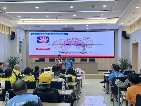 培训现场,邓老师凭借丰富的应急救护经验和专业知识,为骑手们带来了一堂生动实用、内容翔实的急救课。课程围绕日常生活中可能遇到的突发情况,重点讲解了心肺复苏(CPR)的操作流程、自动体外除颤器(AED)的使用方法、气道异物梗阻的急救(海姆立克法)以及中暑、扭伤等常见意外的初步处理措施。采用“理论讲解+实操演示”相结合的方式,逐步分解每一个急救步骤,强调关键要点和注意事项。在实操练习环节,骑手们踊跃参与,在老师的专业指导下,利用模拟人认真练习心肺复苏的按压深度和频率,相互配合演练海姆立克急救法。现场学习氛围浓厚,互动积极。